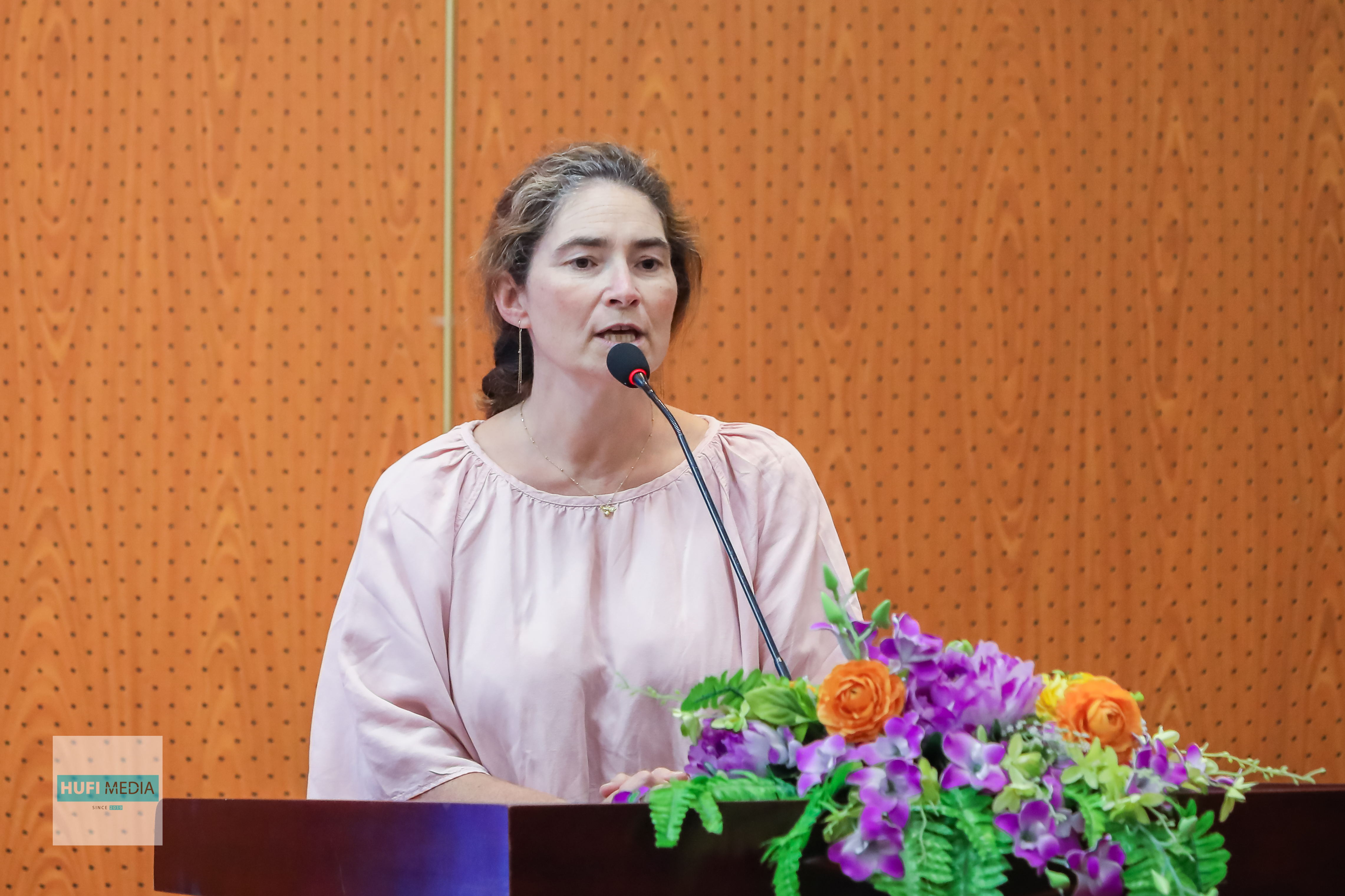 After the opening speech, Assoc. Prof. Dr. Le Nguyen Doan Duy - Dean of Faculty of Food Science and Technology gave Professor Liesbeth a souvenir along with a bouquet of fresh flowers to express his gratitude on the occasion of Teacher's Day. Professor came to Vietnam to visit and work at HUFI and hope to continue welcoming her to participate in more activities at the faculty in the future.