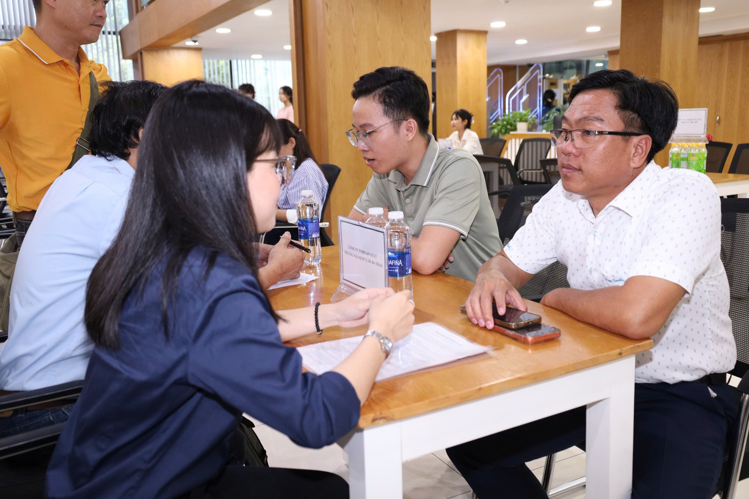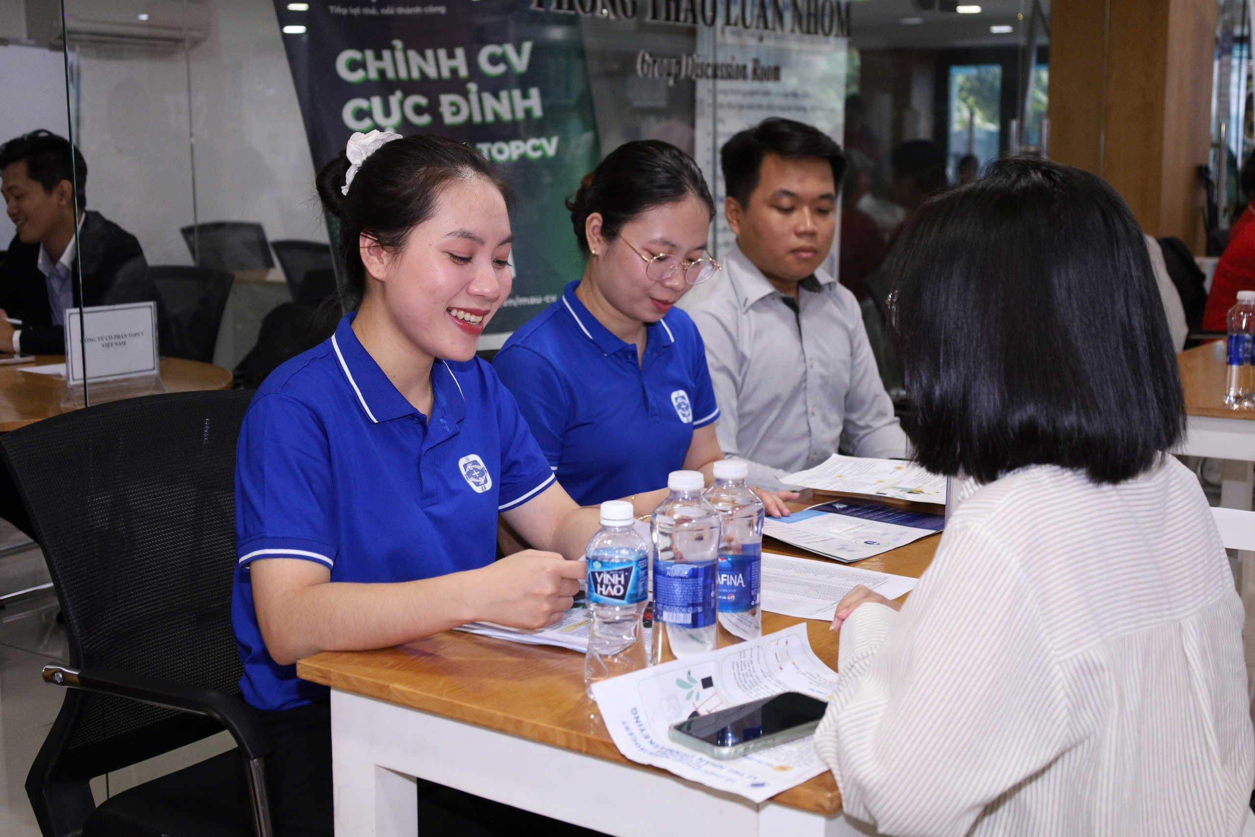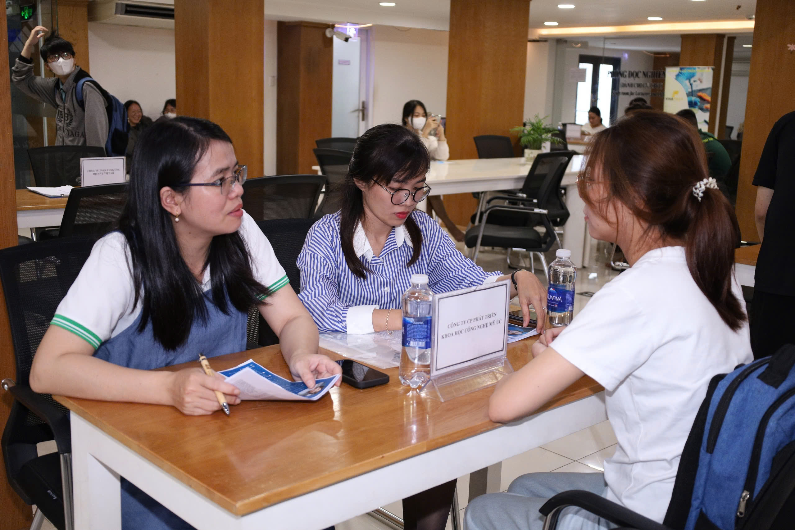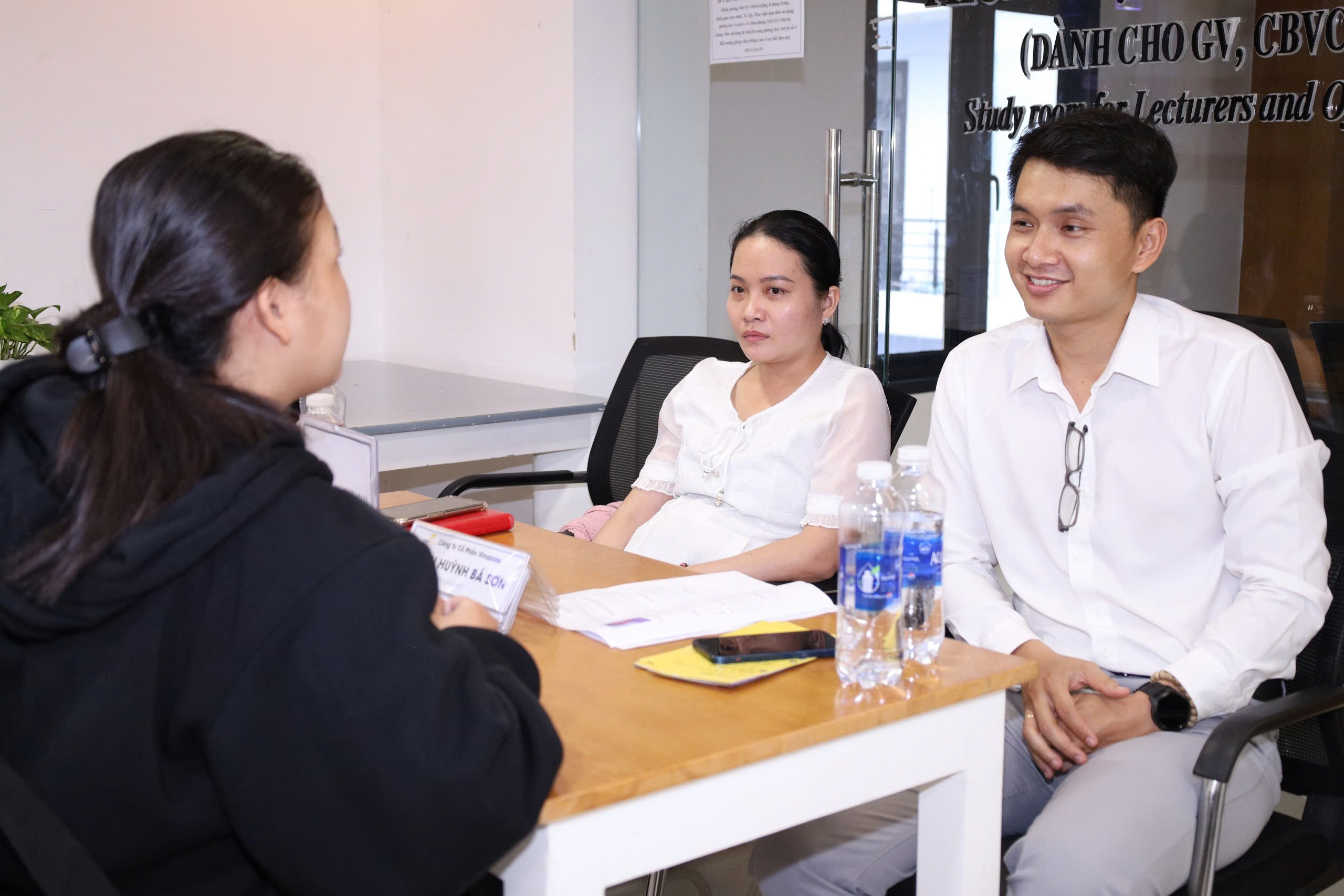 Buổi phỏng vấn tuyển dụng trực tiếp tại Thư viện giữa sinh viên và đại diện các doanh nghiệp. Đây là cơ hội vàng để sinh viên thể hiện năng lực, kỹ năng và tự tin chinh phục vị trí thực tập, việc làm ngay tại sự kiện.