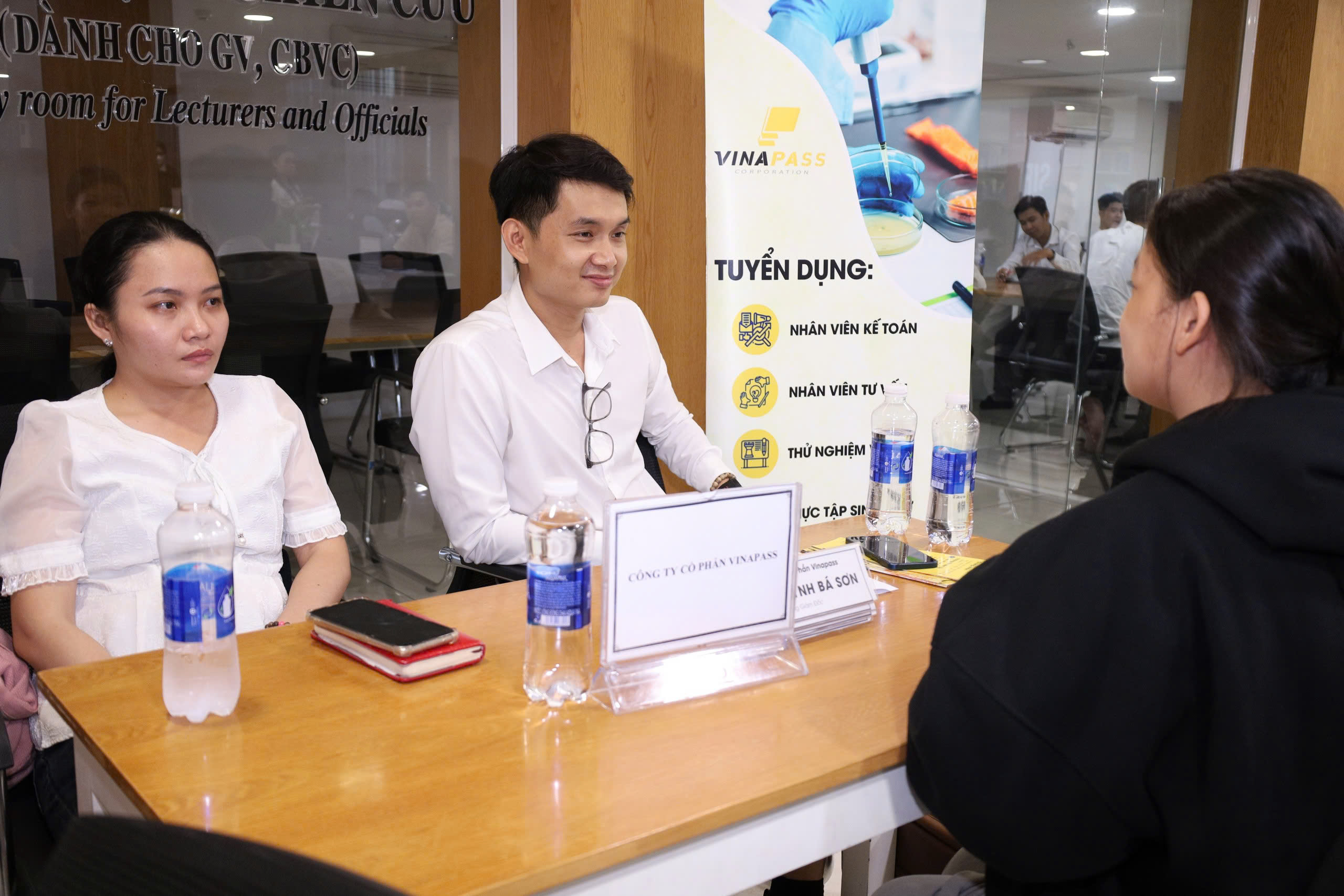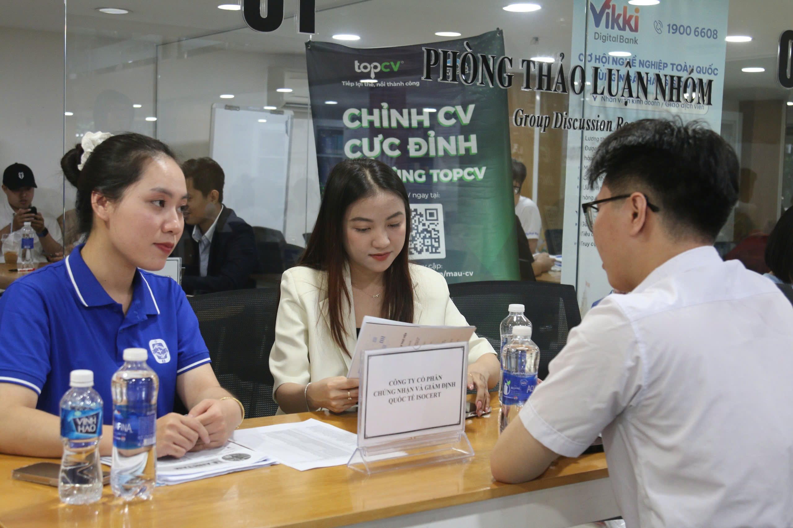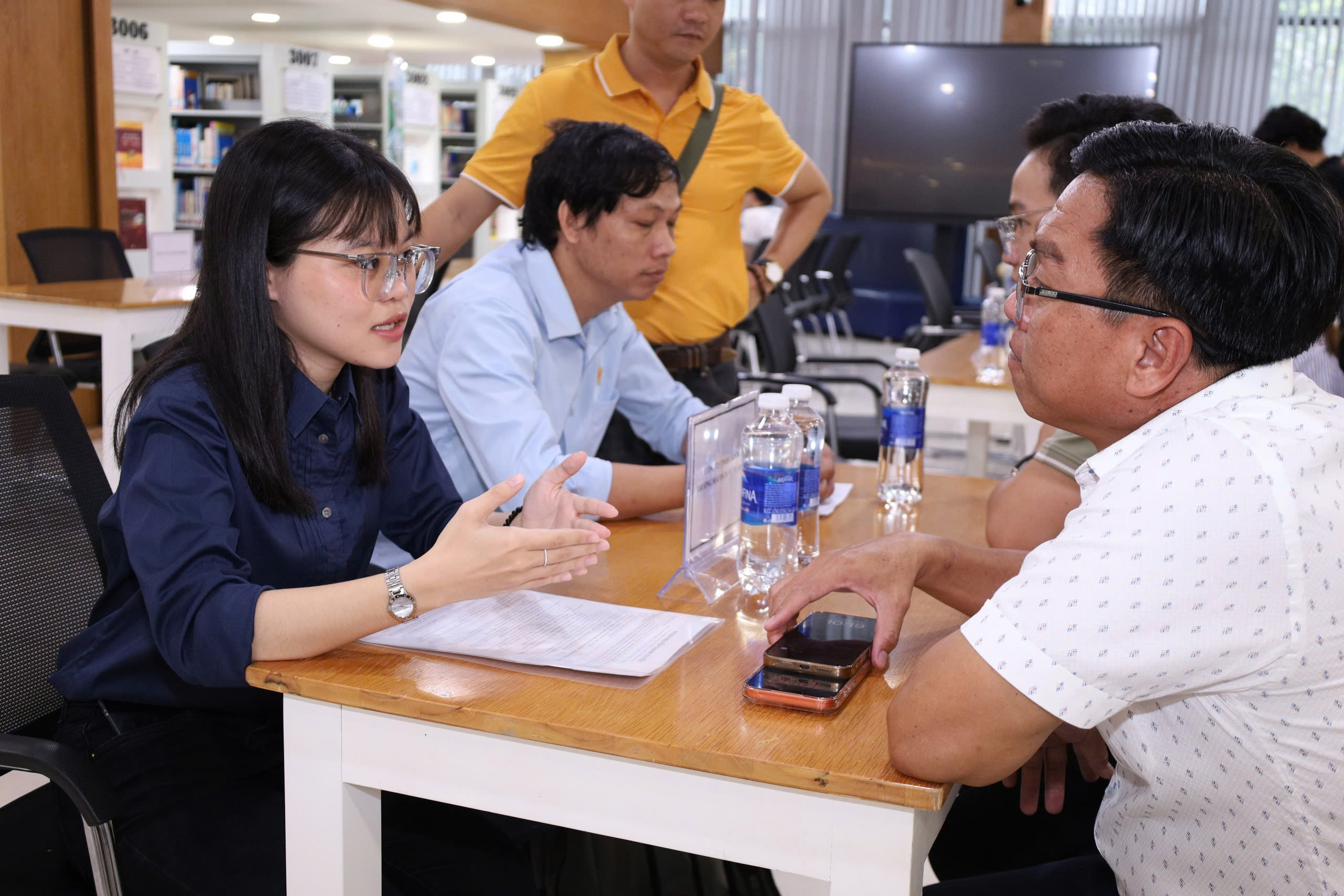 Buổi phỏng vấn tuyển dụng trực tiếp tại Thư viện giữa sinh viên và đại diện các doanh nghiệp. Đây là cơ hội vàng để sinh viên thể hiện năng lực, kỹ năng và tự tin chinh phục vị trí thực tập, việc làm ngay tại sự kiện.