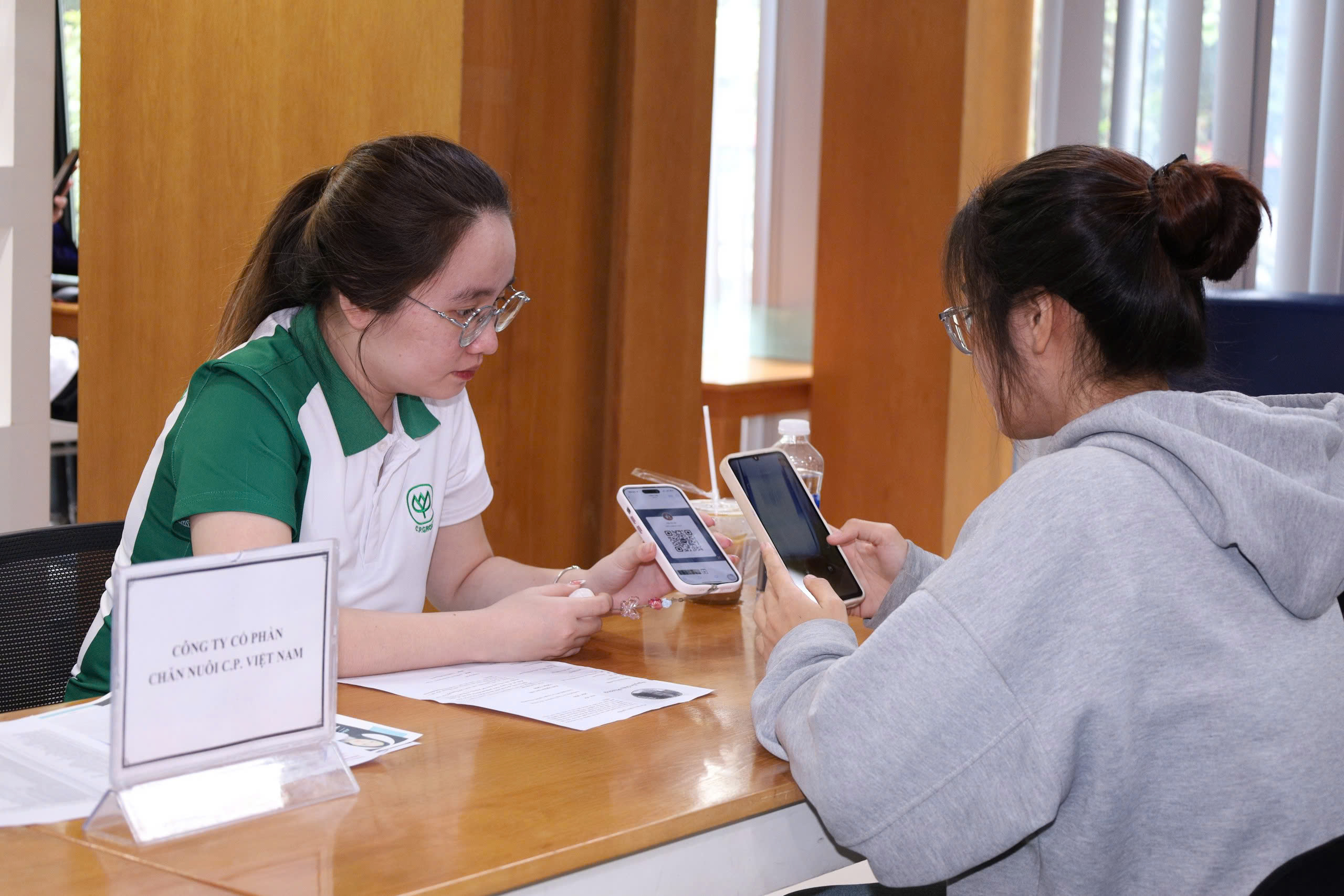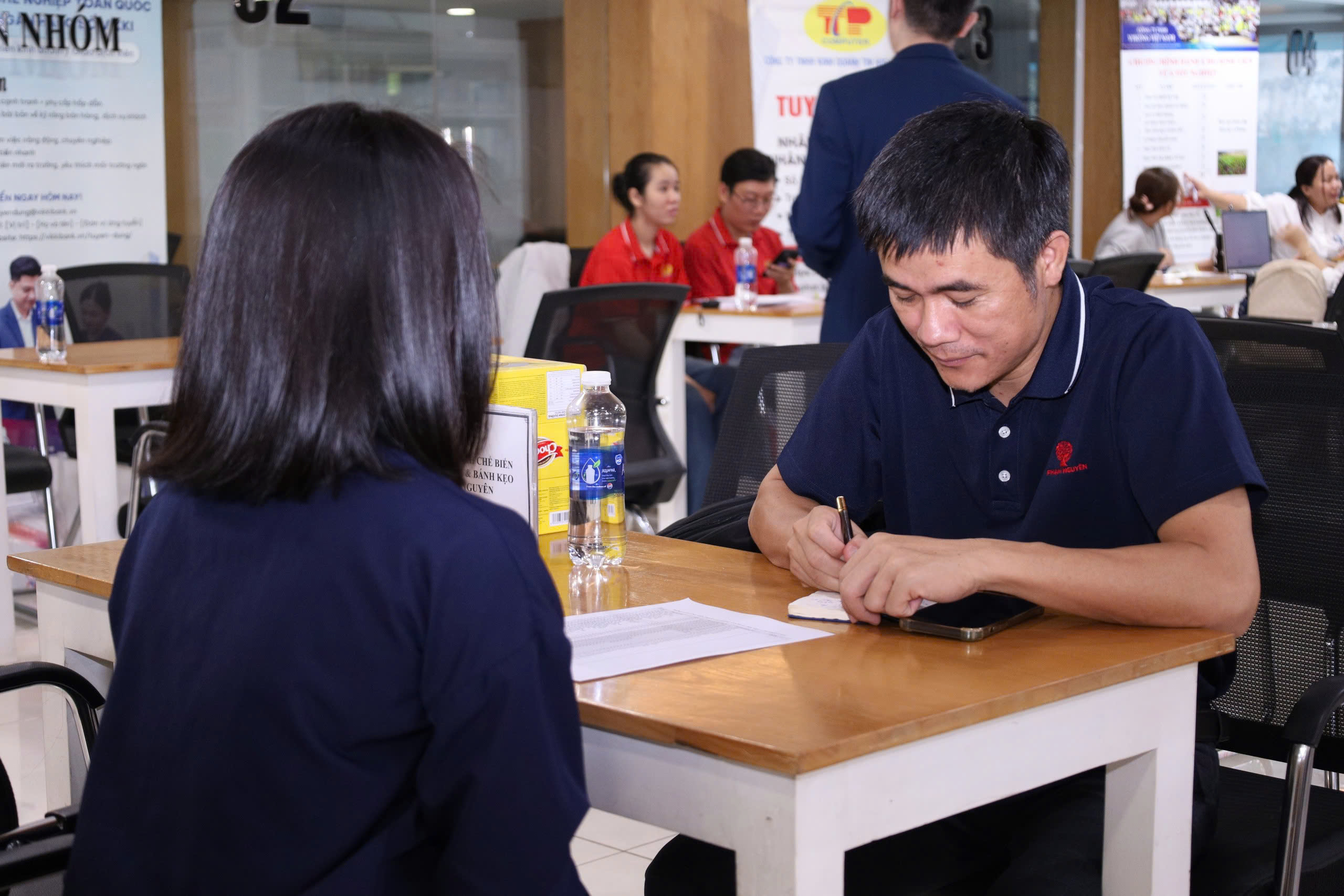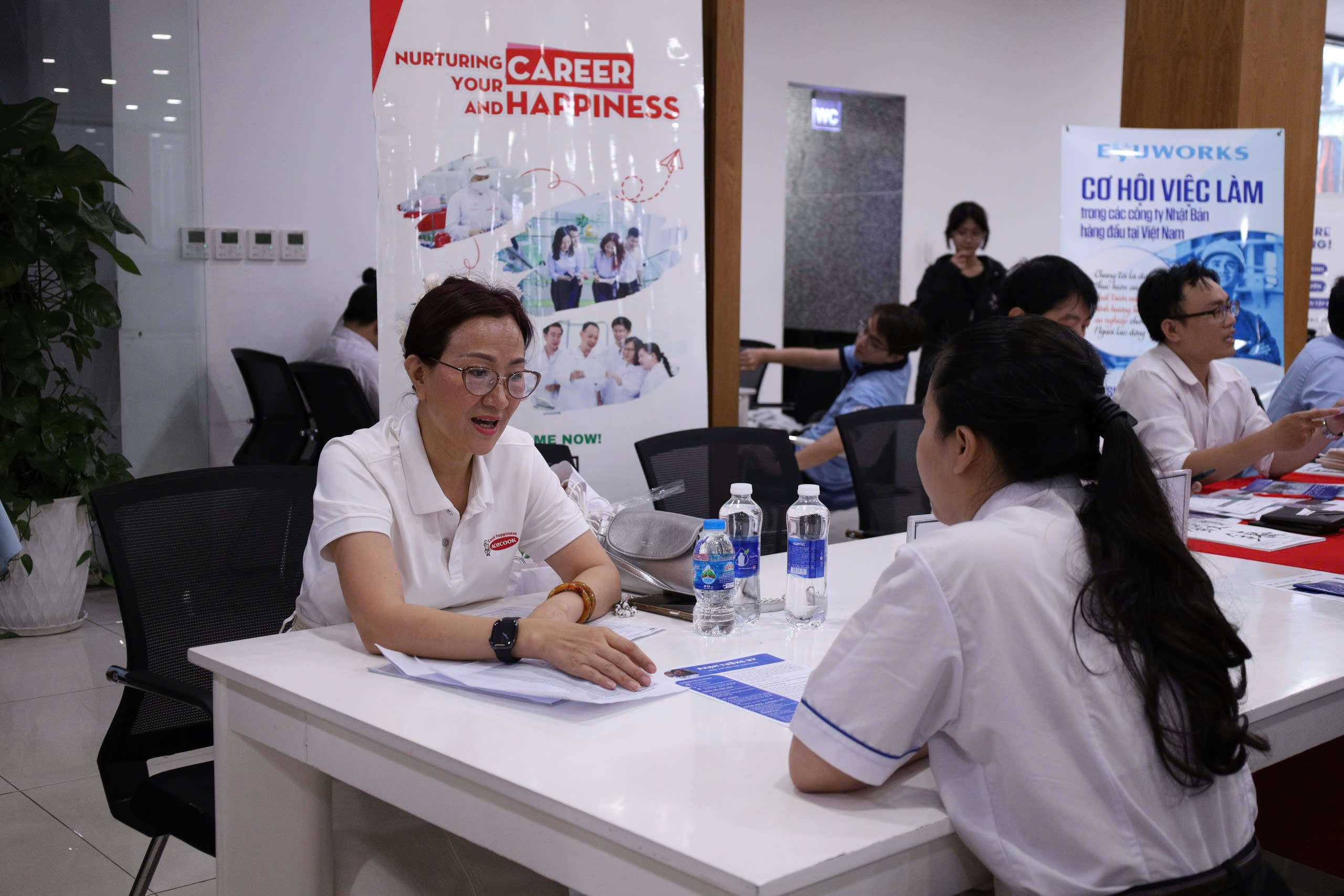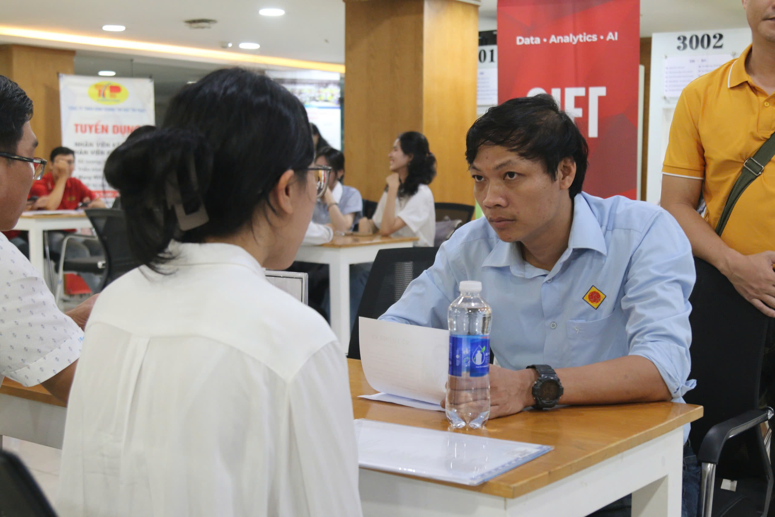 Buổi phỏng vấn tuyển dụng trực tiếp tại Thư viện giữa sinh viên và đại diện các doanh nghiệp. Đây là cơ hội vàng để sinh viên thể hiện năng lực, kỹ năng và tự tin chinh phục vị trí thực tập, việc làm ngay tại sự kiện.
