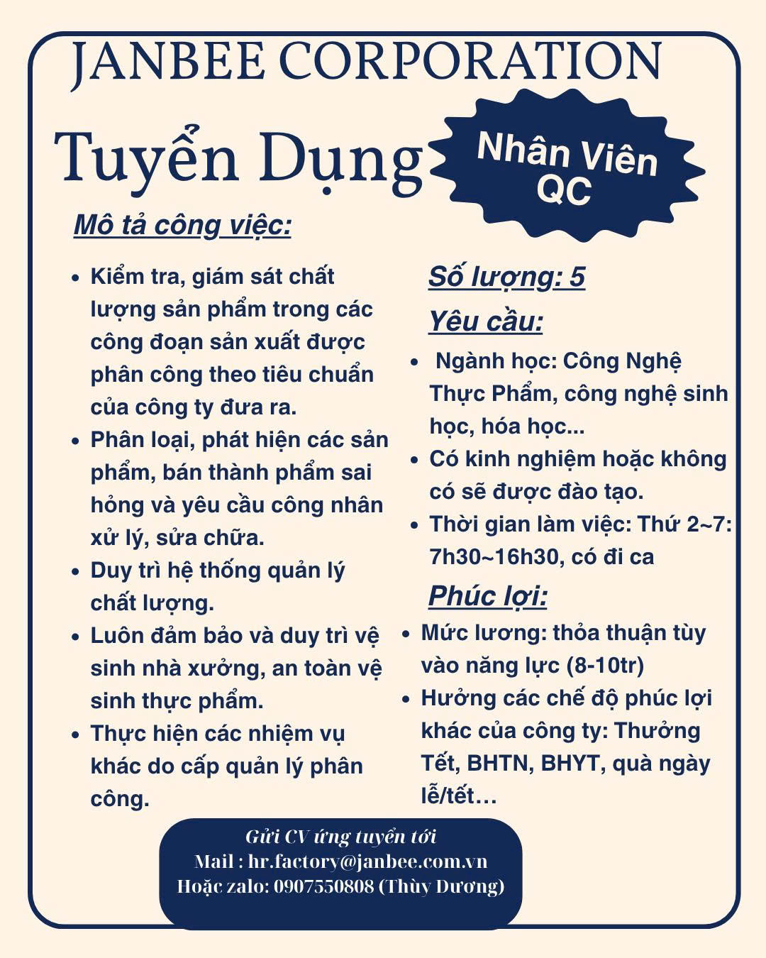 Công ty cổ phần Janbee tuyển dụng nhân viên QC